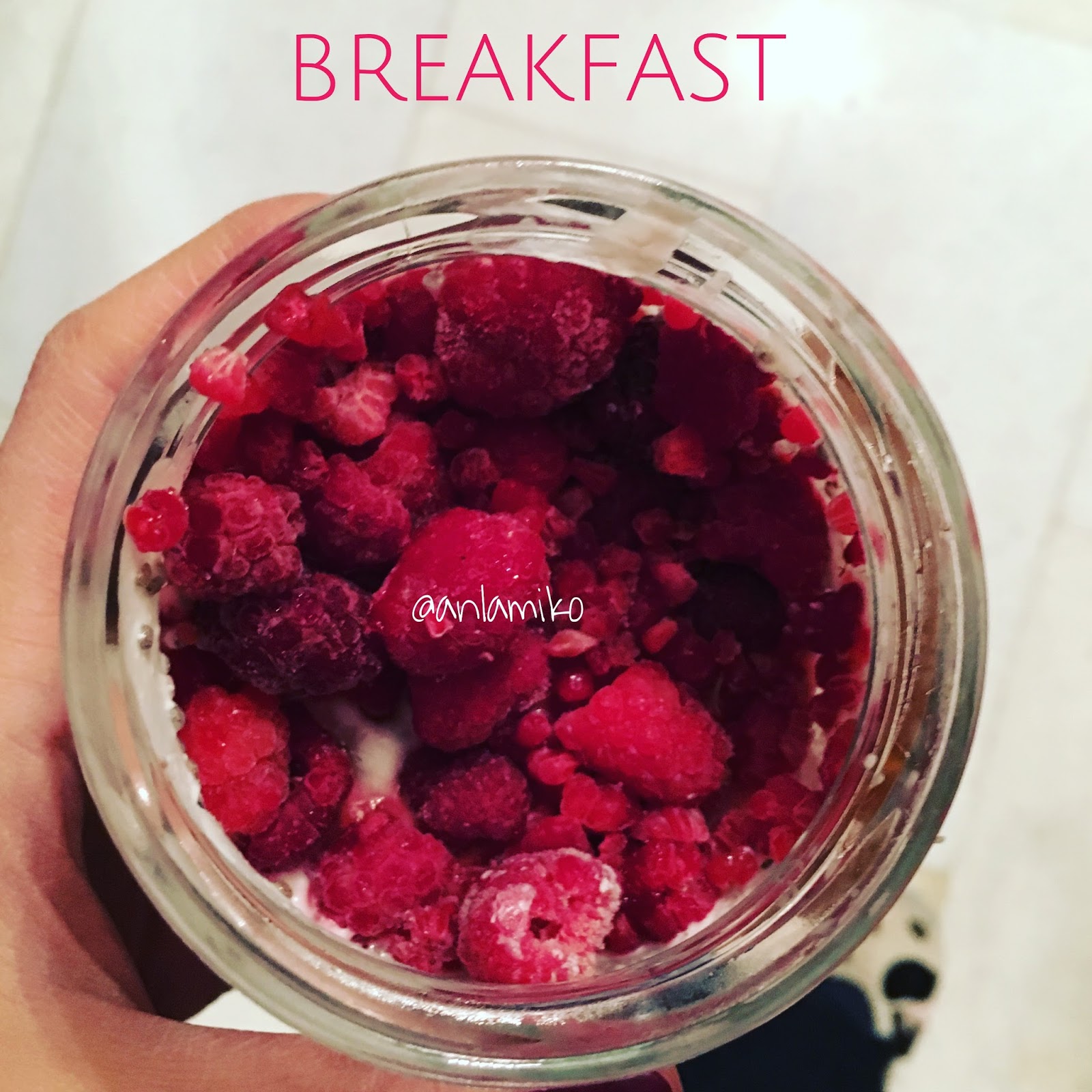 Evden çıkmadan da üzerine dondurulmuş çilek ve biraz tatlandırması için evde hazırladığım granoladan ekliyorum.